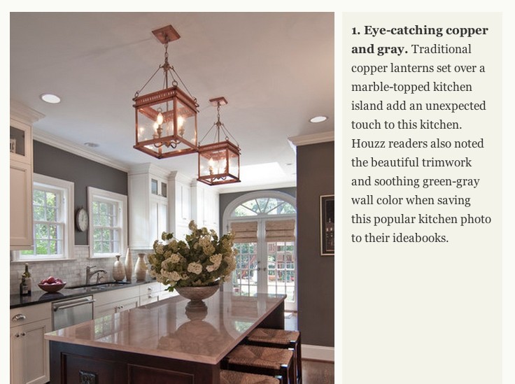 Traditional copper lanterns set over a marble-topped kitchen island add an unexpected touch to this kitchen.