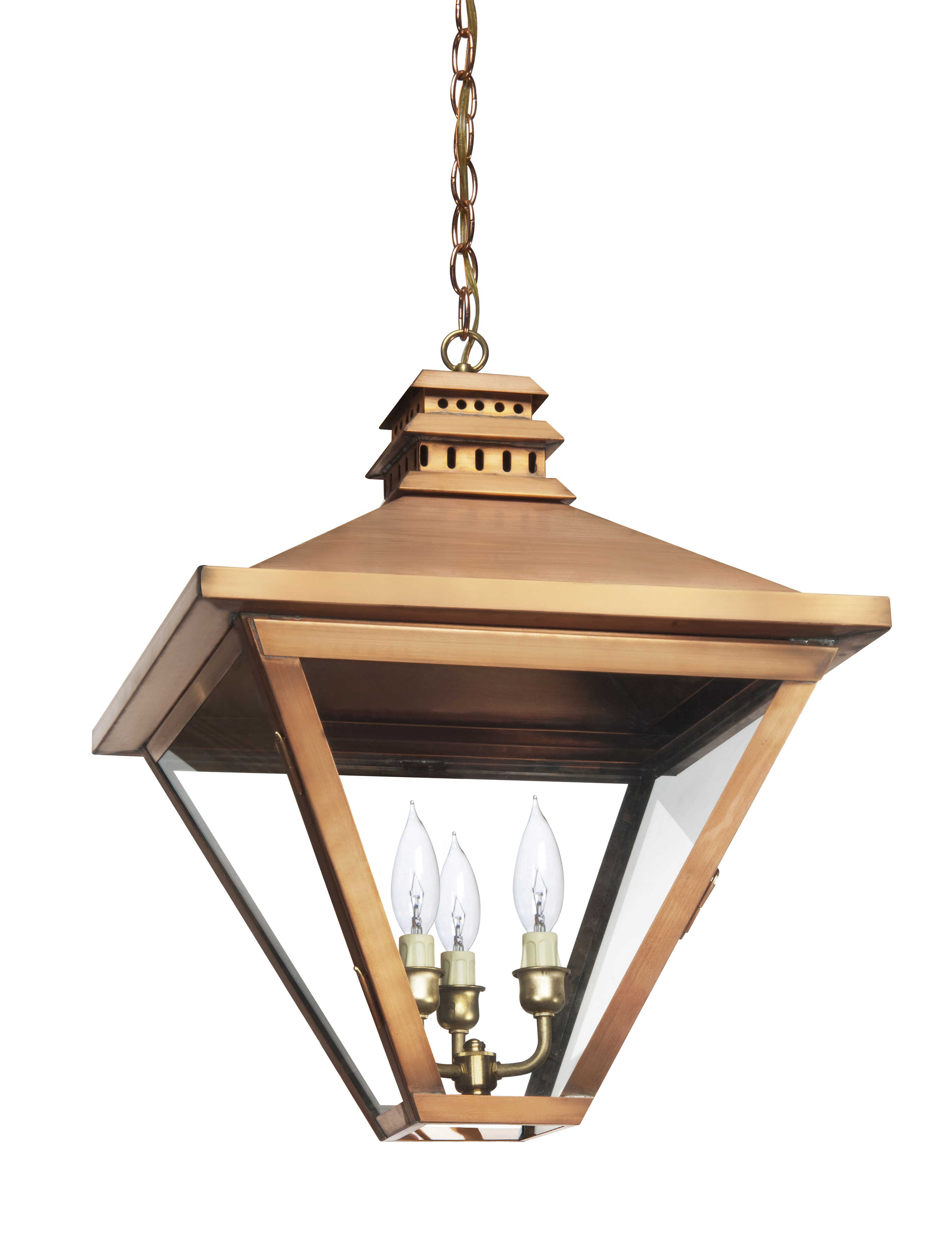 The CS-8, a classically styled hanging light from the Church Street Collection of gas and electric lighting, measures 21h x 17.5w x 17.5d. This electric copper lantern, with its angled side panels and top, will illuminate interior or exterior of your home in solid copper, aged bronze, or black finishes
